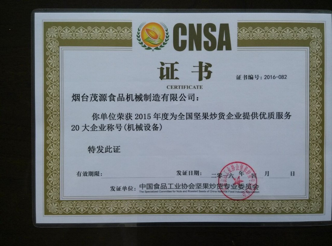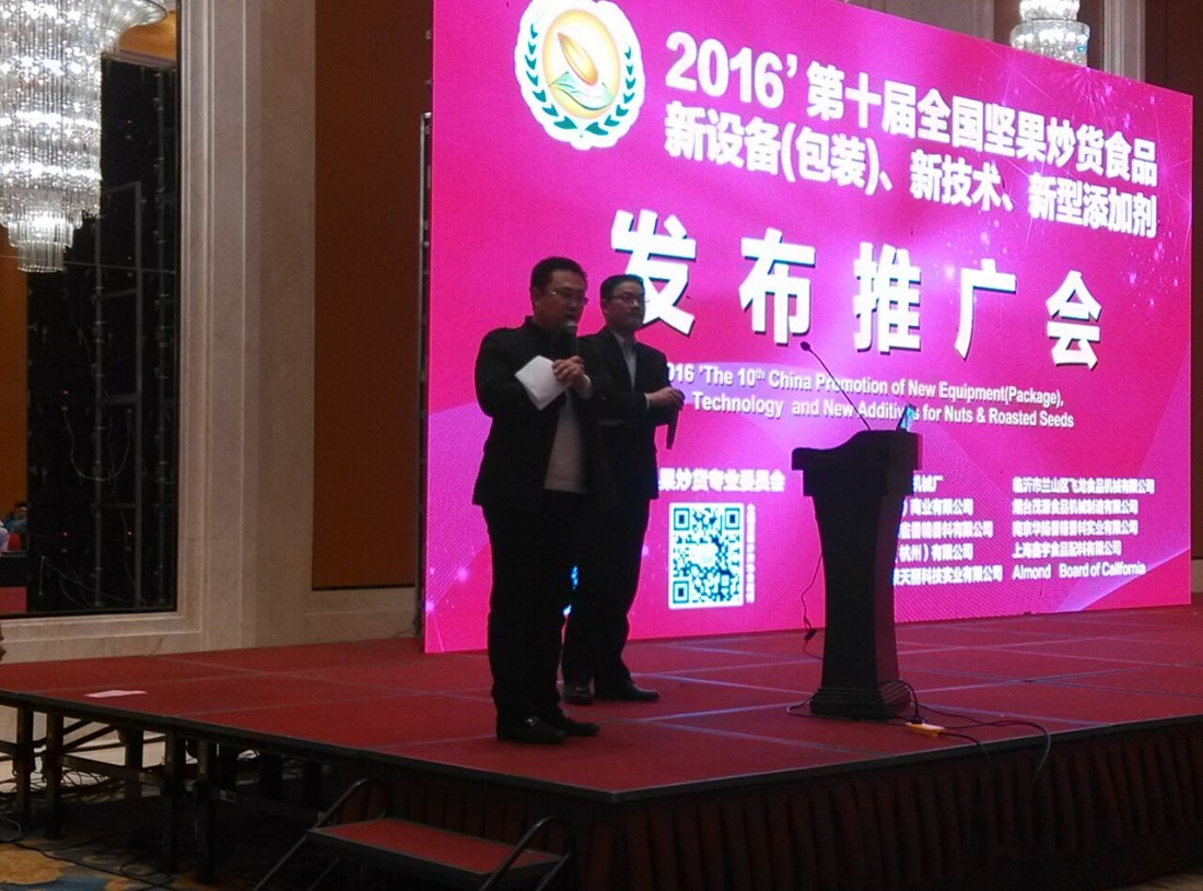 展會期間,主辦單位還舉辦了全國堅果炒貨行業(yè)國內外新設備(包裝)、新技術、新型添加劑、配料等新產品推廣發(fā)布會,發(fā)布了2015-2016年全國堅果炒貨行業(yè)新設備和新型添加劑的使用分析和預測報告,還有9家中外企業(yè)的11項新設備(包裝)、新技術、新型添加劑進行了推介發(fā)布。煙臺茂源食品機械制造有限公司作為9家中外企業(yè)之一在這次大會上了做了新設備的推介發(fā)布,并和現場業(yè)內同行進行提問互動。會后,舉辦了2015年度全國堅果行業(yè)優(yōu)秀企業(yè)的頒獎典禮,煙臺茂源等20個企業(yè)被評為2015年度為全國堅果炒貨企業(yè)提供優(yōu)良服務企業(yè)稱號。