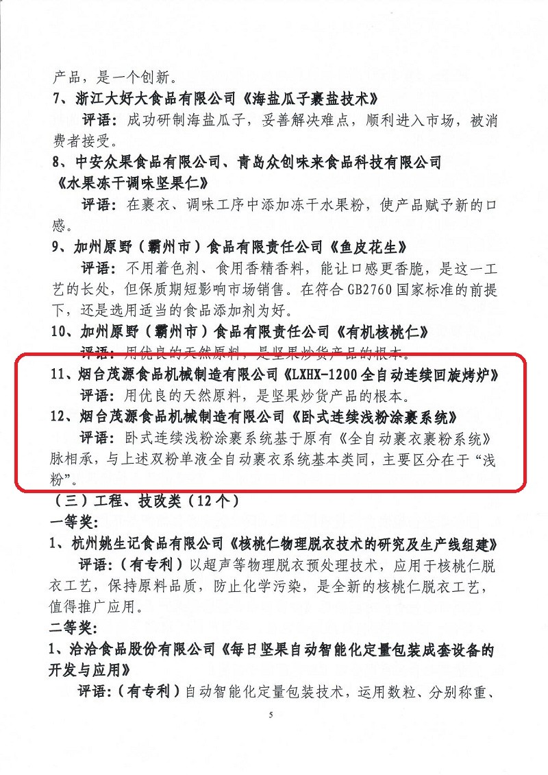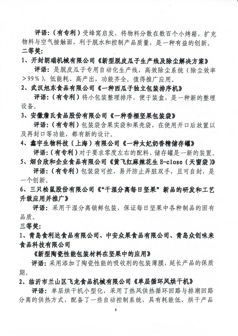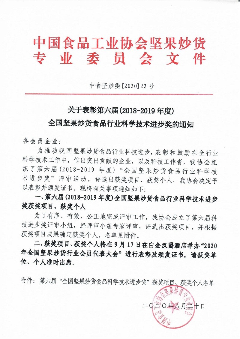 關(guān)于表彰第六屆(2018-2019年度)全國堅(jiān)果炒貨食品行業(yè)科學(xué)技術(shù)進(jìn)步獎(jiǎng)的通知