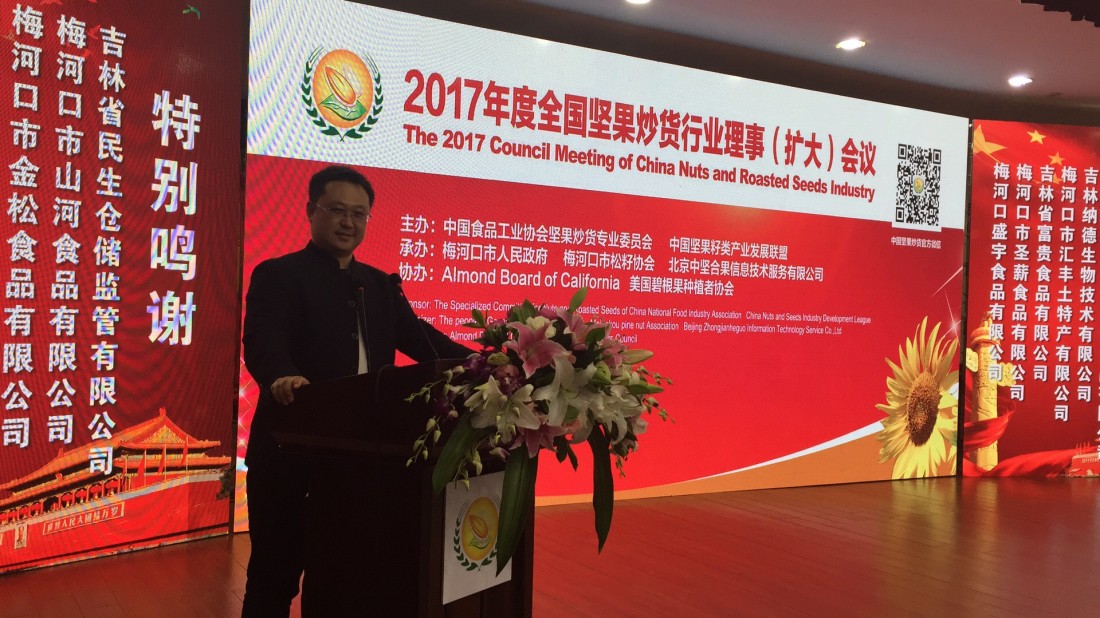 由中國食品工業(yè)協(xié)會堅果炒貨專業(yè)委員會主辦的“2017年度全國堅果炒貨行業(yè)理事會(擴(kuò)大)會議”,于2017年10月23日—25日在吉林梅河口市召開。出席此次會議的代表有:協(xié)會執(zhí)行會長、副會長、全體理事單位;梅河口市政府、廣西龍州縣政府、云南臨滄縣政府有關(guān)部門領(lǐng)導(dǎo)以及吉林省有關(guān)市縣的領(lǐng)導(dǎo);出席的有關(guān)部門還有國家食藥監(jiān)總局三司、吉林省食品安全質(zhì)量檢驗(yàn)檢測所,以及美國、俄羅斯、越南、巴基斯坦等國家堅果協(xié)會、企業(yè)代表,共計500余人參加了會議。