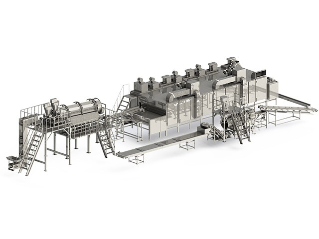 簡介:采用噴淋、涂層、鍍膜工藝及多層調味技術,從溶液、前粉、后粉三部分來進行調味,產品口感更加豐富立體。裹衣單元中噴淋設備內部獨特的結構,大大提高了原輔料的接觸機會,裹衣效果更加均勻,降低了產品的次品率。堅果仁原料以及半成品通過傳送帶運輸,依次經過提升機進入主要加工設備——連續(xù)式淺粉涂裹設備,然后進行油炸/烘烤,進行二次裹粉調味后再進入冷卻,再進行包裝,全自動化連續(xù)作業(yè)提高生產效率,保證產品品質。